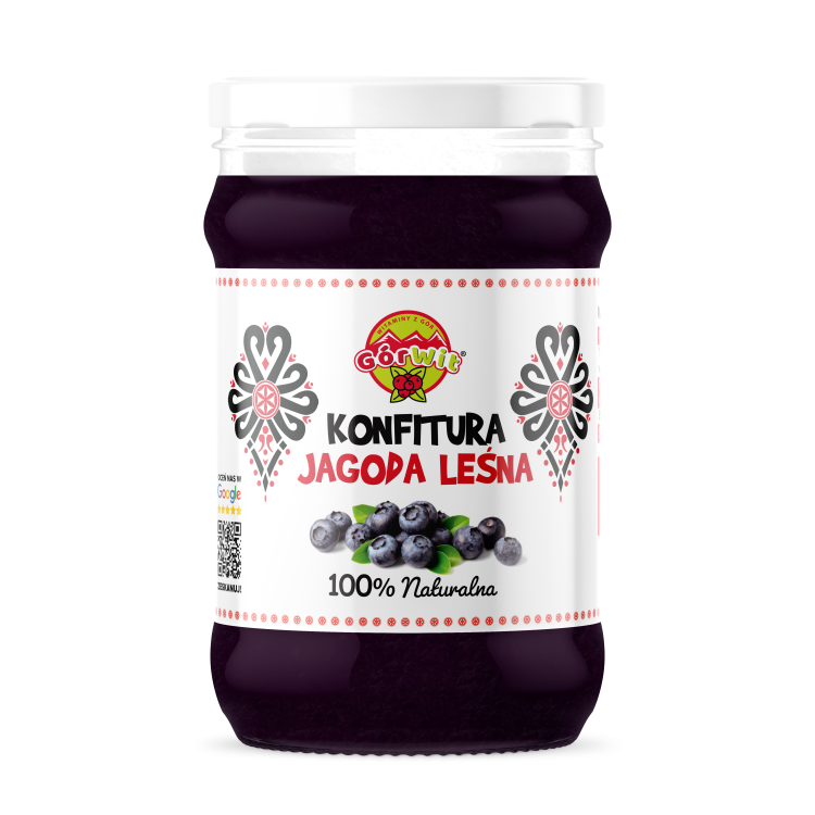 jagoda 65%, cukier. Sporządzono z 65g jagód na 100g produktu.
