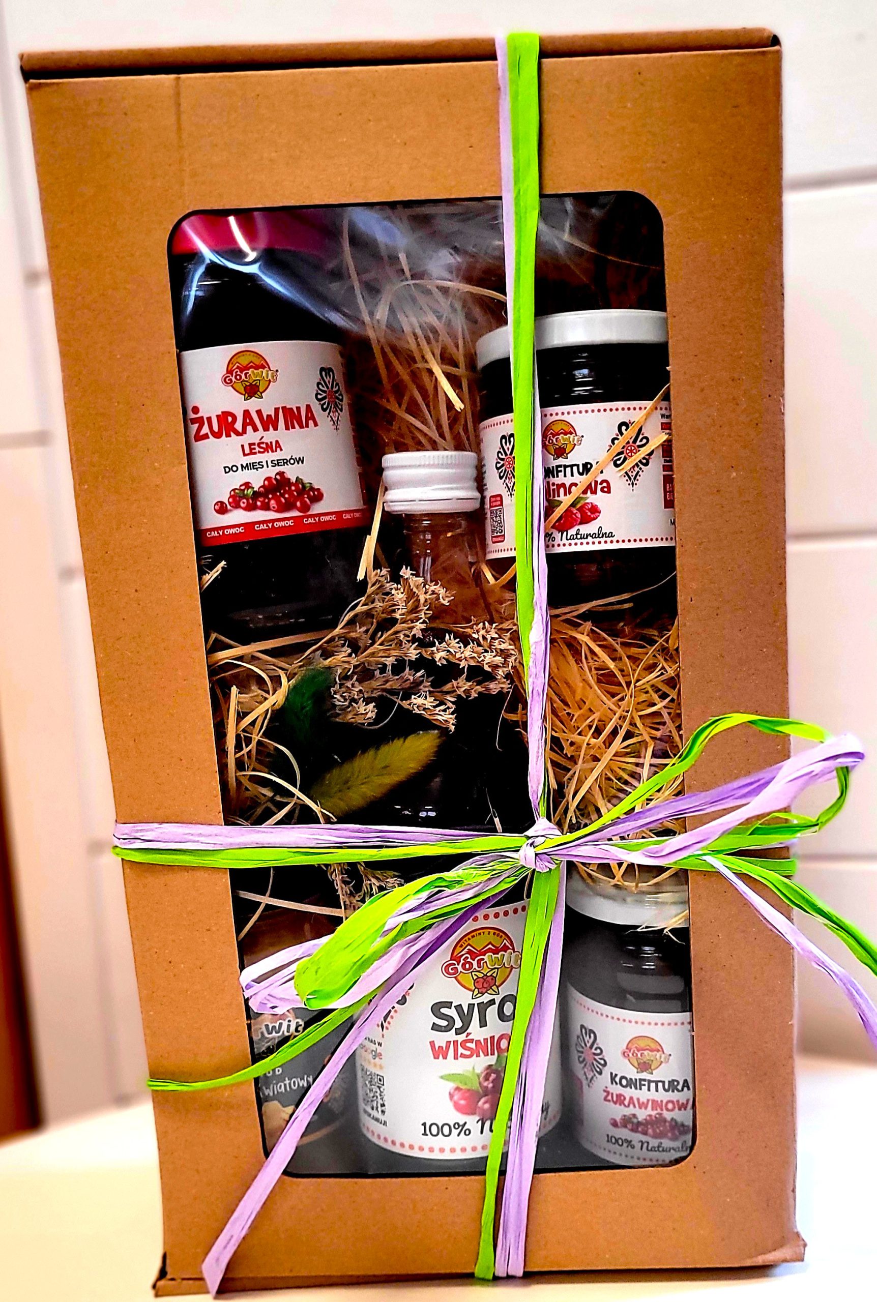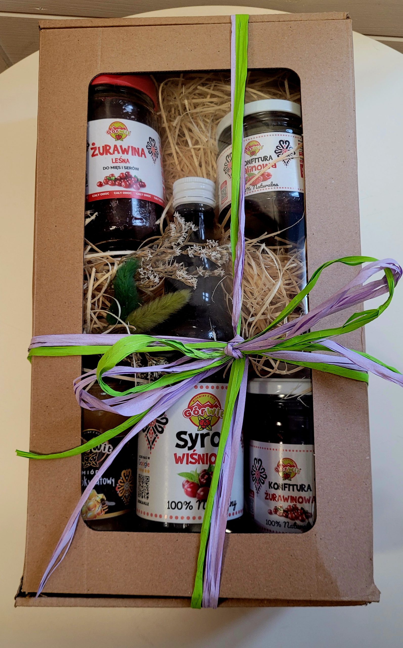 Wyjątkowy upominek, który zachwyci każdego miłośnika naturalnych smaków. Elegancko zapakowany zestaw zawiera pyszne syropy i konfitury powstałe z owoców najwyższej jakości. Produkty zapakowane są w pudełko z tektury falistej, w środku wyścielone naturalną słomą i uzupełnione pachnącymi dodatkami plastrem pomarańczy, laską cynamonu, suszonym anyżem. Całość zdobi elegancka wstążka z kokardką.